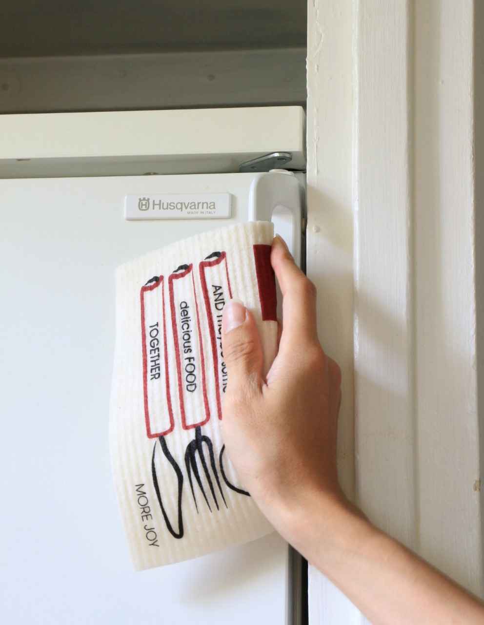 スポンジワイプMore Joyレッドワイン・アンド・ディナーで冷蔵庫を拭く